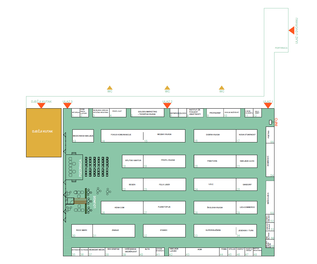 Promocije i razgovori s autorima održavaju se na glavnoj pozornici koja se zajedno sa sajamskim dijelom nalazi u velikoj dvorani, dok se dječji program provodi u tzv. Dječjem kutku (ping-pong dvorana) te u konferencijskoj dvorani na 1. katu.